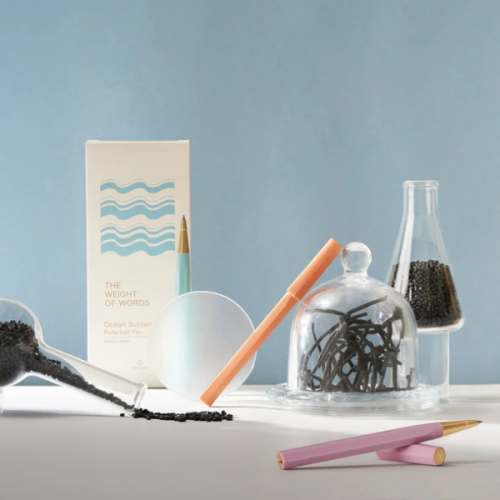 Bolígraf roller fet amb niló reciclat provinent de xarxes de pesca de Taiwan, llautó, aliatge d’alumini i paper certificat FSC.