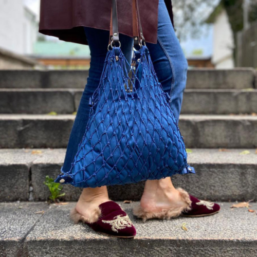 Bossa feta a mà de niló amb reixeta elàstica Té una nansa de cuir marró fosc. També es pot portar a l’espatlla.