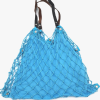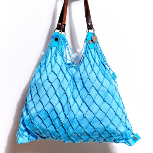 Bossa feta a mà de niló amb reixeta elàstica Té una nansa de cuir marró fosc. També es pot portar a l’espatlla.