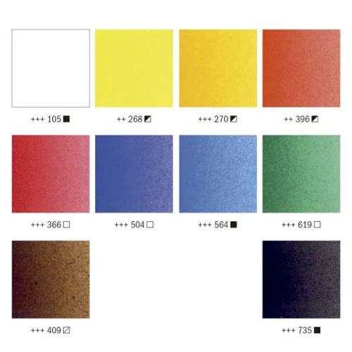 Blanc titani (105), Groc azo clar (268), Groc azo fosc (270), Vermell naftol mitjà (396), Rosa quinacridona (366), Blau ultramar (504), A6 (619), Terra ombra torrat (409), Negre òxid (735).
