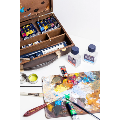 Set complet de pintures a l’oli TITAN Arts Extra Fine amb 12 tubs de 20 ml i 1 de 60 ml, acompanyats d’accessoris professionals en una elegant caixa de fusta. Qualitat superior per a artistes i aficionats.