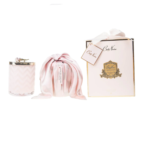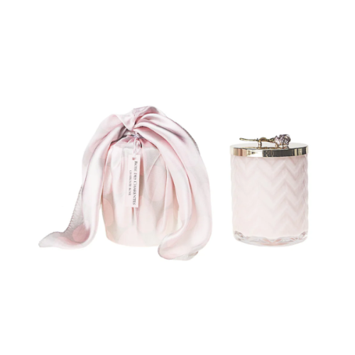 Inclou l’espelma perfumada amb la fragància Charante Roses, mexes dobles de cotó, tapa decorativa de color rosa i daurat, bufanda de seda i la caixa de regal de luxe amb el llaç.