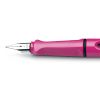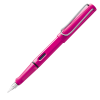 Cos de plàstic brillant color rosa. Clip de metall. Empunyadura ergonòmica per a una millor subjecció. Plomí M (mitjà) d’acer polit. Inclou cartutx LAMY T10 blau. Es pot utilitzar convertidor LAMY Z28.