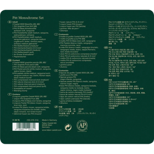 Aquest estoig metàl·lic de 21 peces monocromàtiques Pitt de Faber-Castell és la solució ideal per a “l’artista mòbil”. Dissenyat per ser pràctic i portàtil, és perfecte per a esbossos i estudis gràfics amb carbonet, grafit, llapis d’artista i sanguines.