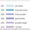 Inclòs: N60 cool grey6, N95 cool grey1, 062 pale yellow, 192 asparagus, 243 mint, 245 sap green, 451 sky blue, 452 process blue, 553 mist blue, 603 periwinkle, 623 purple sage, 673 orchid, 723 pink, 761 carnation, 772 blush, 873 coral, 912 pale cherry, 990 light sand.