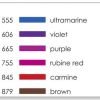 Inclòs: N15 black, 055 process yellow, 173 willow green, 296 green, 346 sea green, 535 cobalt blue, 555 ultramarine, 606 violet, 665 purple, 755 rubine red, 845 carmine, 879 brown, 899 redwood, 905 red, 925 scarlet, 947 burnt sienna, 977 saddle brown, 985 chrome yellow.