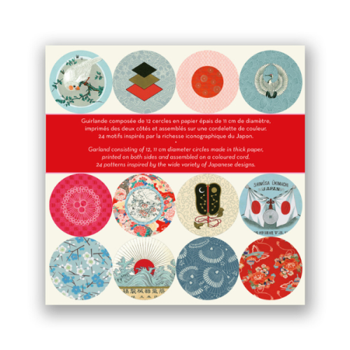 Ja vé llesta per penjar-la, amb 12 cercles de paper resistents, cadascun amb 11 cm de diàmetre i impresos per les dues cares. Els cercles ja venen muntats en un cordó de 3 metres de llarg. Cada garlanda es presenta en una capsa tipus capsa de llumins de 16 x 16 cm.