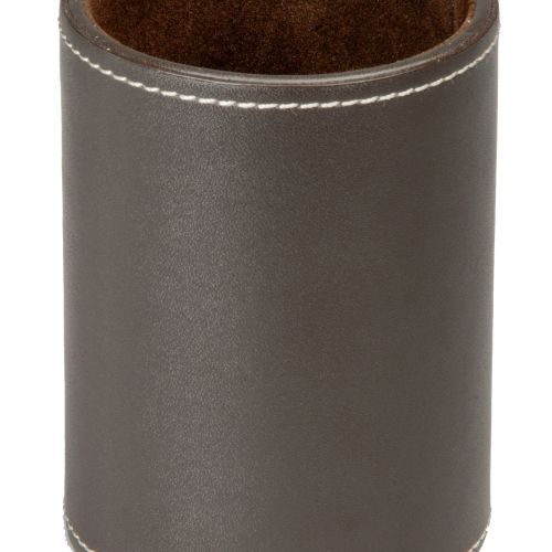 Elegant gobelet de forma cilíndrica.Material: simil-pell.Folre interior vellutat agradable al tacte.Color: marró.Mesures: 105 x 85 mm de diámetre.Perfecte per organitzar bolígrafs, llapis, tissores, i altres articles de papereria.