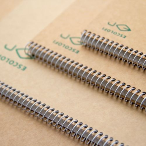 Llibreta despiral mida DIN A4. Tapes de cartró rígid reciclat, color natural (certificat per FCR®). 100 fulls de paper reciclat de 80gr, amb quadricula de 5mm (certificat per FCR®).