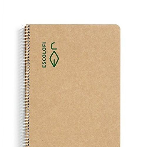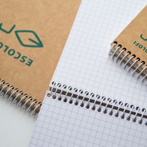 Llibreta despiral mida DIN A5. Tapes de cartró rígid reciclat, color natural (certificat per FCR®). 100 fulls de paper reciclat de 80gr, amb quadricula de 5mm (certificat per FCR®).