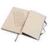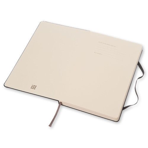 Tamany Large: 13 x 21cm. La Moleskine am el seu estil més simple i clàssica. La tapa dura està lligada a cartró amb les cantonades arrodonides i amb tancament elàstic. Les 240 pàgines a punts estan fetes de paper lliure d’àcid, color ivori. El quadern inclou una butxaca interna amb fuelle per a notes soltes i targetes.