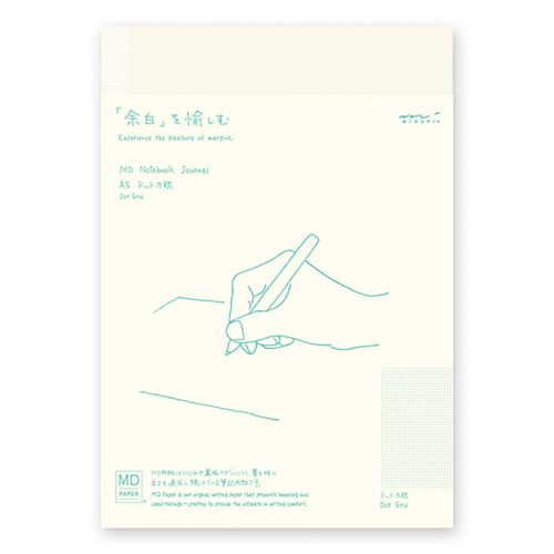 Quadern MD Paper especial per Bullet Journal gràcies a la seva retícula de punts espaiats cada 5 mm. Gràcies a les seves 192 pàgines es pot registrar més de mig any a dia per pàgina, podent dedicar 2 pàgines a diversos dies. Els quaderns Midori MD Paper s’obren completament a 180 º i queda plànols gràcies a la seva enquadernació cosida, que a més proporciona el quadern una gran durabilitat. El paper és apte per a escriptura amb ploma estilogràfica en tota la gamma. Reconeixent la importància de la qualitat de el paper emprat per plasmar records, pensaments i idees per part dels usuaris de quaderns, Midori ha emprat anys perfeccionant el seu paper en la recerca de la comoditat en l’escriptura, la resistència a la tinta i la antitransparència. La simplicitat dels quaderns MD és una de les seves característiques principals, com el fet que no tingui coberta, per d’aquesta manera poder admirar la bellesa de el disseny de la llibreta. El quadern ve amb una fina funda de parafina que el protegeix des del primer ús. És a elecció de l’usuari mantenir-la o llevar-la. També hi ha disponibles cobertes de plàstic transparent, de paper i de cuir especialment dissenyades per als quaderns MD Paper. El paper dels quaderns MD Paper és el mateix que l’utilitzat en els quaderns Traveler ‘s Llibreta. Full amb quadrícula de punts cada 5 mm 192 pàgines Enquadernació cosida Punts de llibre incorporat Mida de producte A5, 210 (alt) x 148 (ample) x 11 (gruix) mm Pes: 286 gr