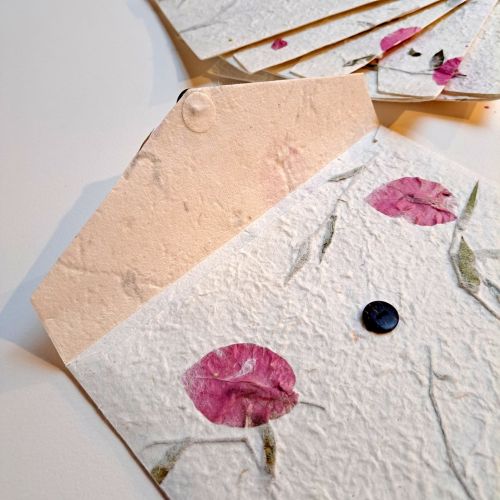 Pack de sis sobres blancs amb pètals rosades incrustades. 22cm d’amplada x 16cm de llargada. Fets a mà amb paper d´alta qualitat, textura fascinant, amb tancament artesanal de botons i cordill.