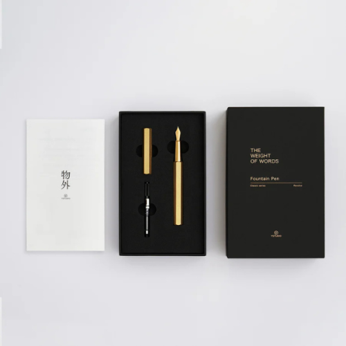 Ploma estilogràfica de llautó amb acabat en laca mat i cantonades polides. Disseny hexagonal amb cos gruixut i pes equilibrat.