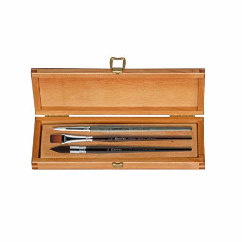Aquest set presentat en una elegant caixa de fusta de pi amb un acabat color mel, envernissada i amb tancaments daurats inclou 3 pinzells Escoda de mànec curt ideals per a aquarel·la. 1430 Perla Toray Blanco Sintètic #10 Rodó a Punta 1322 Prat Tame Sintètic #3/4 Pla Carrado 1530 Últim Tenir sintètic #14 Redondo Pluma