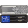 Ambdós instruments es presenten en un estoig metàl·lic d’estil vintage, reutilitzable com a estoig per a bolígrafs o organitzador d’escriptori. Un set d’escriptura atemporal, perfecte com a regal o per acompanyar les teves idees més importants.