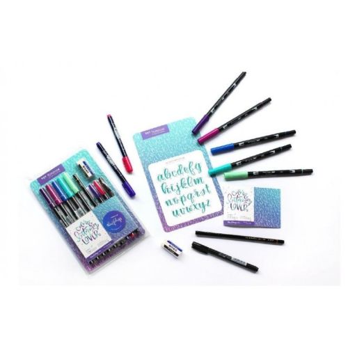 llibret amb pautes, recursos i trucs. 5 retoladors ABT Dual Brush. 2 retoladors Fudenosuke (punta pinzell dura). 1 retolador Fudenosuke (punta pinzell tova). 1 llapis grafit. Goma esborrar Mono Xs. Alfabet en mayáscula i en mináscula.