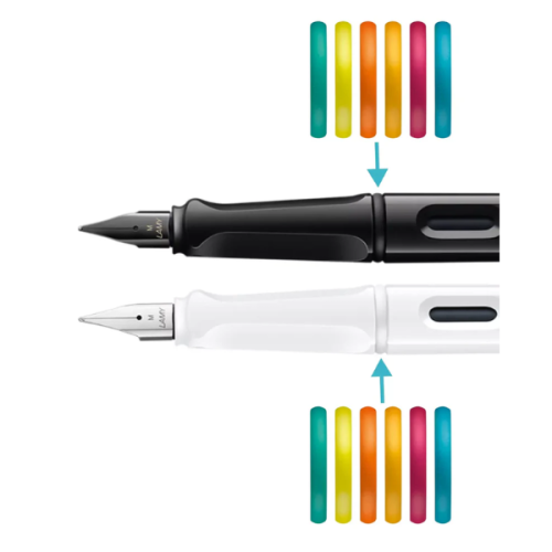 Set multicolor blanc i negre acompanyat d’anells de colors de la sèrie LAMY per a un toc especial.