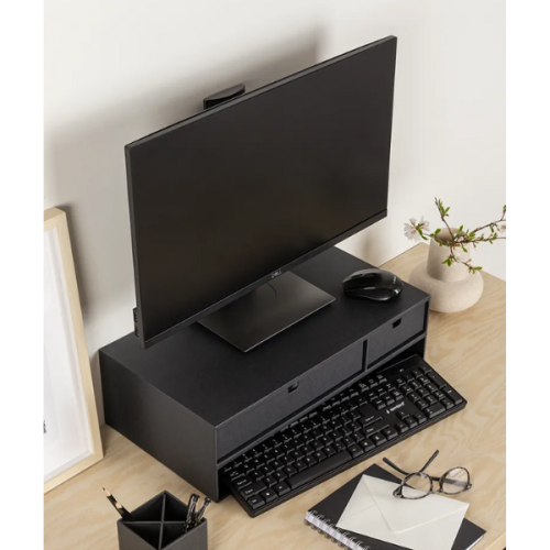 Compta amb dos calaixos; un més gran per guardar papers mida A4 i un altre més petit per altres objectes. Inclou un compartiment obert pel teclat de lordinador i una obertura a la part posterior per al cable. El seu color negre és ideal per combinar amb el teu escriptori i no perdre l’estètica i ordre.