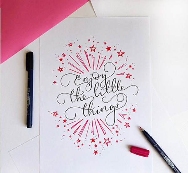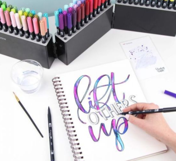 Tècniques de lettering que pots aprendre. Aprèn a treure-li profit als teus TOMBOW: fes traços fins anant dalt a baix, i gruixuts en direcció contrària, exercint tota la pressió que sigui necessària. Aconseguiràs crear lletres elegants, boniques i originals. No hi ha límits per a la teva imaginació. Degrada cada color, combina’ls, crea ombres de diferents tipus. Fes màgia, fes lettering. Les lletres a mà s’han convertit en molt més que només paraules en un paper. Afegir algunes tècniques originals a les teves cartes, a les teves invitacions, a les teves cites, no només afegeix interès visual creant art, sinó que també és divertit i els teus TOMBOW ho faran molt més fàcil i bonic. Prova des de diferents angles i juga amb els espais per donar personalitat a cada lletra. El resultat és completament diferent si deixes angles oberts o si els tanques, o si deixem més o menys espai. Tots aquests detalls ajudaran a definir el teu propi estil. A més, en ser solubles, podràs utilitzar-los per fer fons, mescles i degradacions.