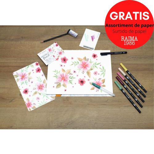 El joc d'aquarel·les floral conté: ABT-192, 757, 772, 910, 991; WS-EFL03 (gruix de línia 0,35 mm); MONO 100 dur (MONO-100-H); RECOLLIDA DE POLS MONO (A-DC); mitjà de raspall d'aigua (WB-ME-1P); paleta de barreja; instruccions